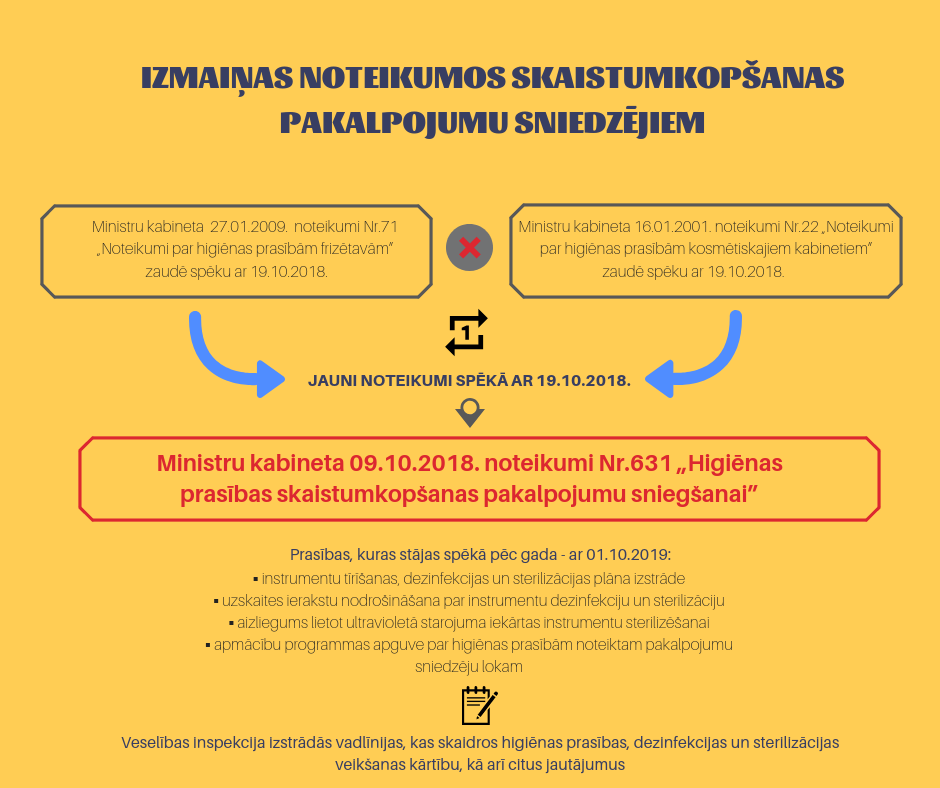 Pēc Veselības Inspekcijas un nozares ekspertu ierosinājuma, balstoties uz infekcijas slimību pieaugošo risku, Veselības Inspekcijas kontroles datiem, nozares attīstības tendencēm, jaunu tehnoloģiju, invazīvu procedūru ienākšanu kosmētiķa ikdienā, kā arī uz ES Eiropas skaistumkopšanas pakalpojumu Standartu EN 16708: 2016 „Beauty salons services”, šī gada laikā ir gaidāmas izmaiņas esošajos MK noteikumos Nr.22 ,,Par higiēnas prasībām kosmētiskajiem kabinetiem”. Šobrīd apstiprināšanai Ministru Kabinetā ir iesniegts jauns noteikumu projekts „Higiēnas prasības skaistumkopšanas pakalpojumu sniegšanai”, kas apvienos un papildinās divu spēkā esošu Ministru kabineta noteikumu prasības – “,,Par higiēnas prasībām kosmētiskajiem kabinetiem (Nr.22) un MK noteikumus ,,Par higiēnas prasībām frizētavām” (Nr.71). Projekta mērķis ir mazināt infekciju slimību risku un nodrošināt drošākus skaistumkopšanas pakalpojumus patērētājiem. Lai to sasniegtu, jau esošo noteikumu prasības ir papildinātas ar jaunām.