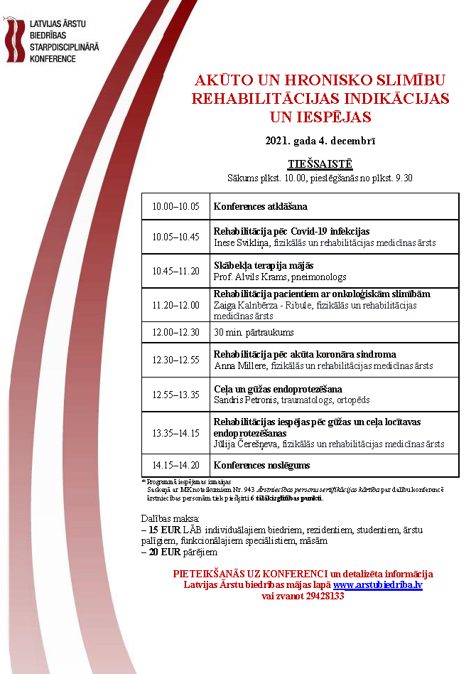 Aicinām pieteikties uz tiešsaistes starpdisciplināro konferenci “AKŪTO UN HRONISKO SLIMĪBU REHABILITĀCIJAS INDIKĀCIJAS UN IESPĒJAS”. Tiešraide notiks sestdien, 4. decembrī, plkst. 10.00-14.20. Par dalību konferencē ārstniecības personām tiek piešķirti 6 tālākizglītības punkti.