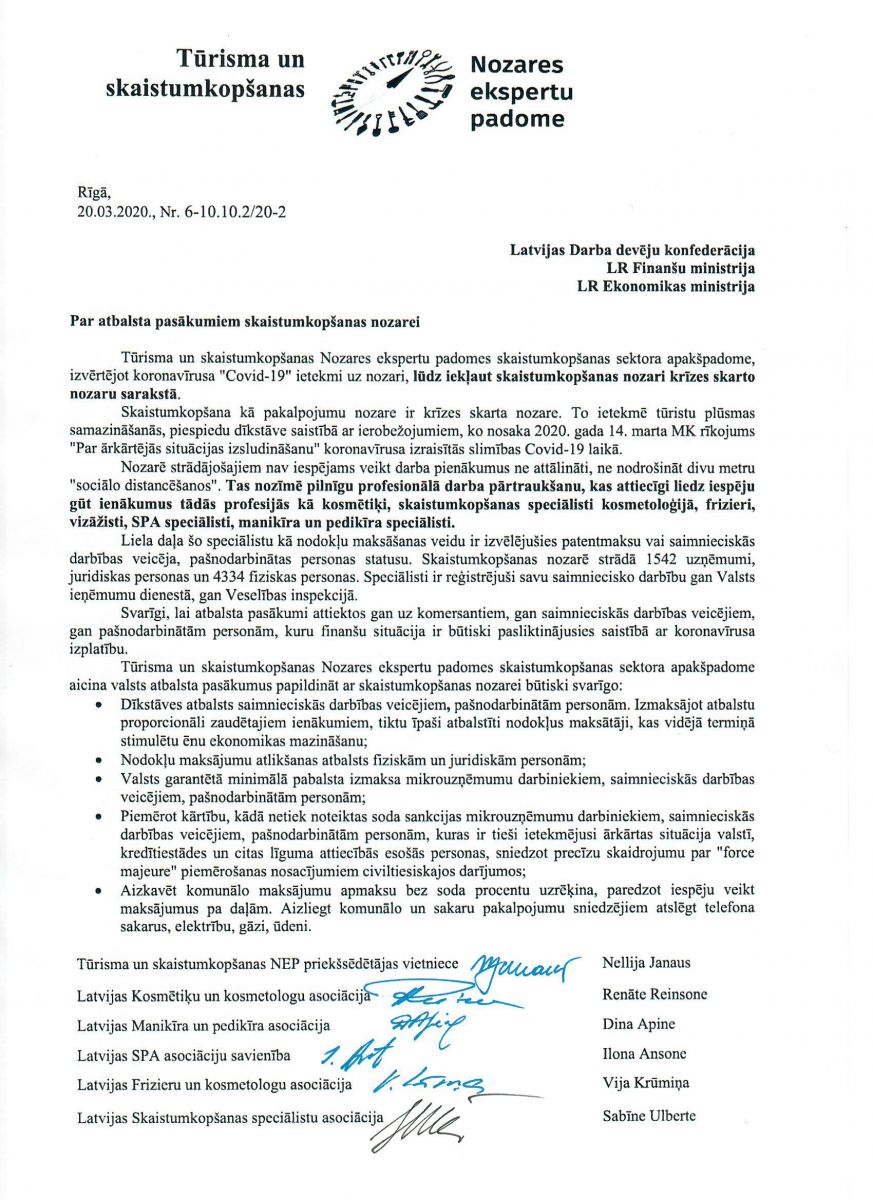 Par atbalsta pasākumiem skaistumkopšanas nozarei 23/03/2020 Tūrisma un skaistumkopšanas nozares ekspertu padomes skaistumkopšanas sektora apakšpadome, izvērtējot koronavīrusa "Covid-19" ietekmi uz nozari, lūdz valdību iekļaut skaistumkopšanas nozari krīzes skarto nozaru sarakstā.